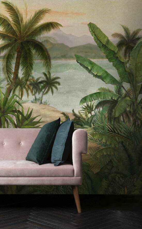 Estampa = Paisagem | Painel | Coqueiro | Praia | Areia | Folhas | Folha | Montanha | Céu