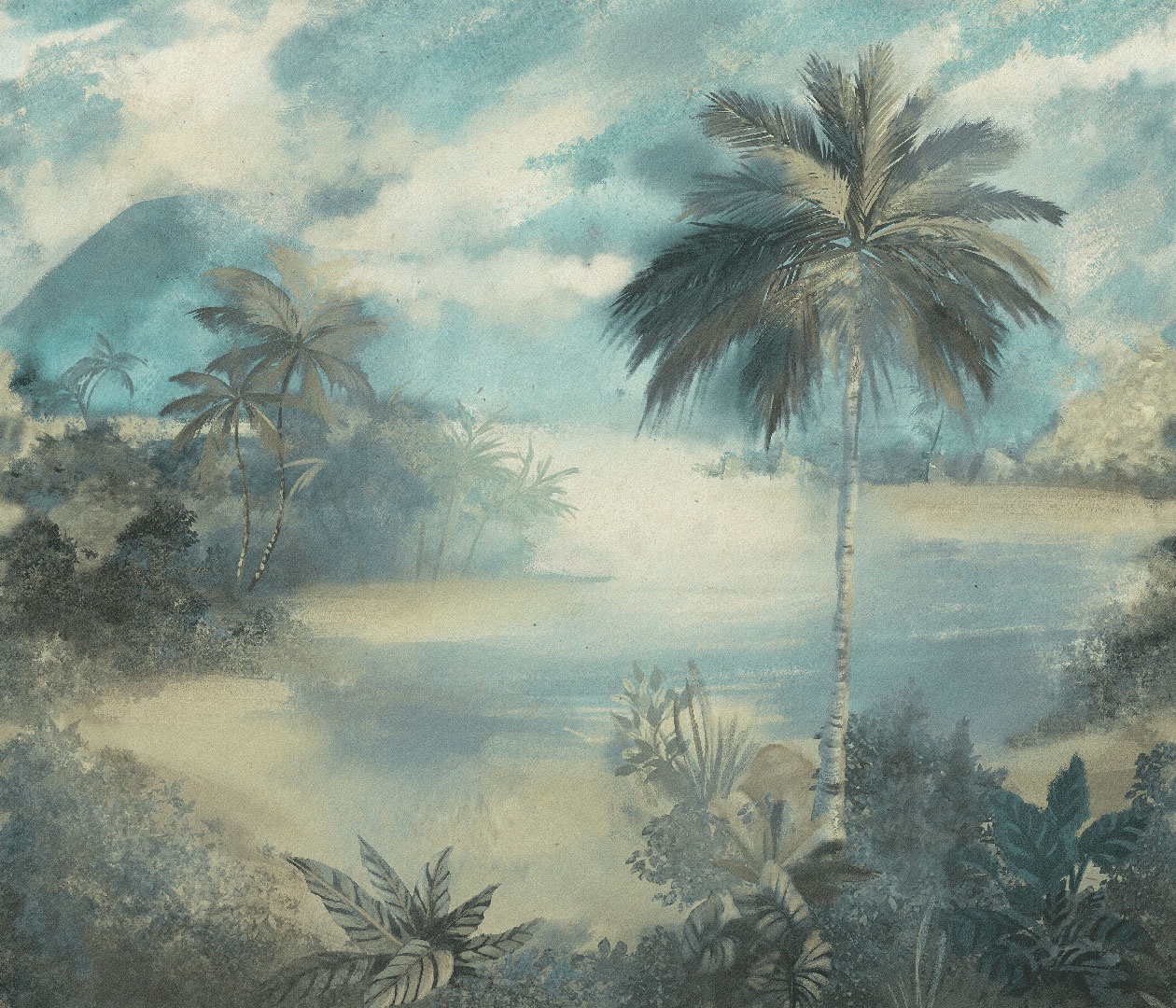 Estampa = Paisagem | Rio | Coqueiro | Folha | Árvore | Folhas | Painel | Montanha | Nuvem | Neblina