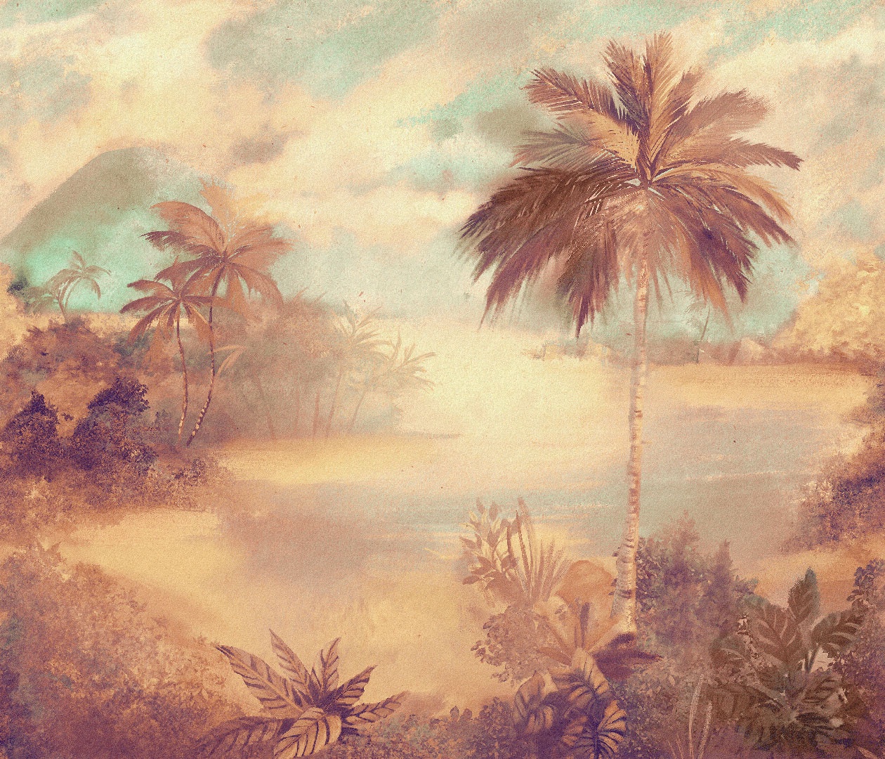 Estampa = Paisagem | Rio | Coqueiro | Folha | Árvore | Folhas | Painel | Montanha | Nuvem | Neblina