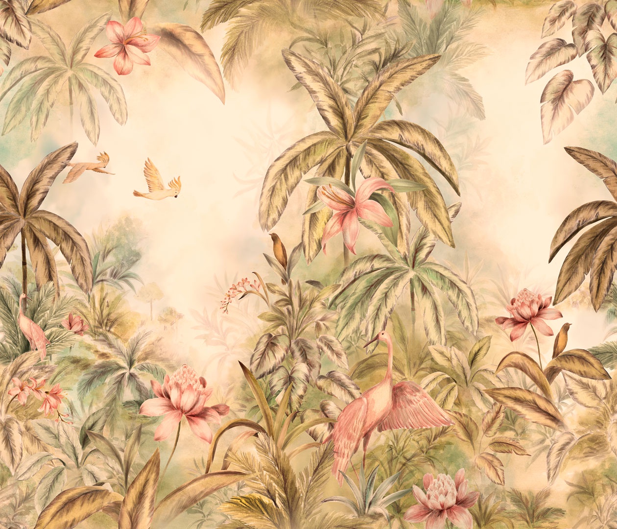 Estampa = Natureza | Folhagem | Palmeiras | Plantas | Flores | Pássaros | Flamingo | Selva | Tropical | Exótico | Céu | Verão | Vegetação | Painel | Animal | Folha | Flor