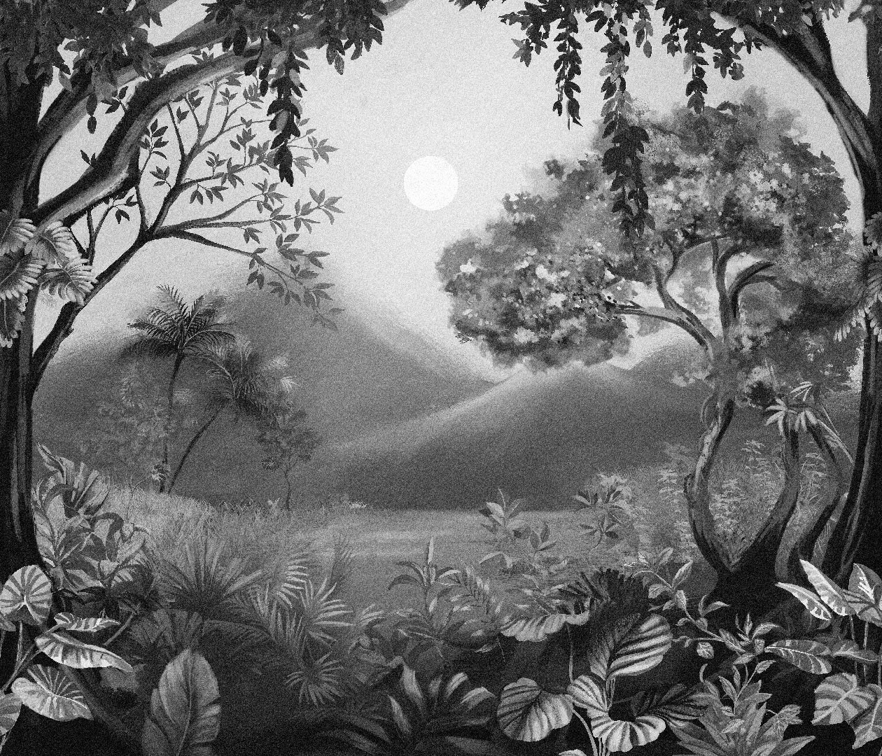 Estampa = Paisagem | Rio | Coqueiro | Folha | Árvore | Folhas | Painel | Montanha | Flores | Flor | Lua | Céu | Noite