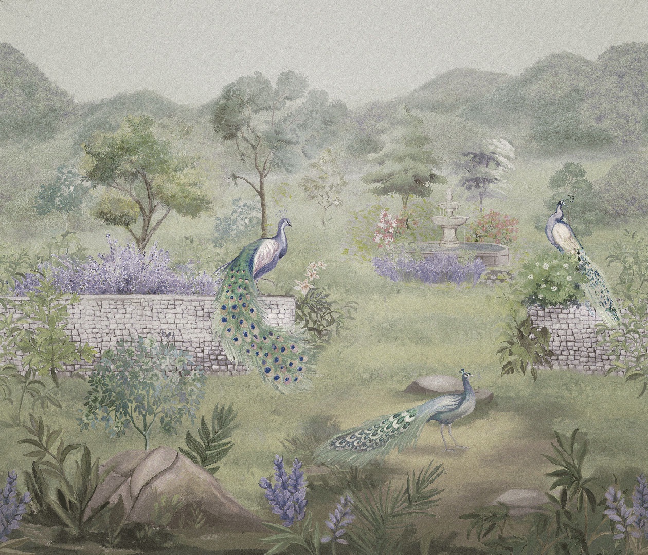 Estampa = Natureza | Jardim | Paisagem | Montanhas | Árvores | Folhagem | Pavões | Fonte | Muro | Muro de pedra | Vegetação | Flores | Galhos | Cauda | Pássaros | Painel | Folha |