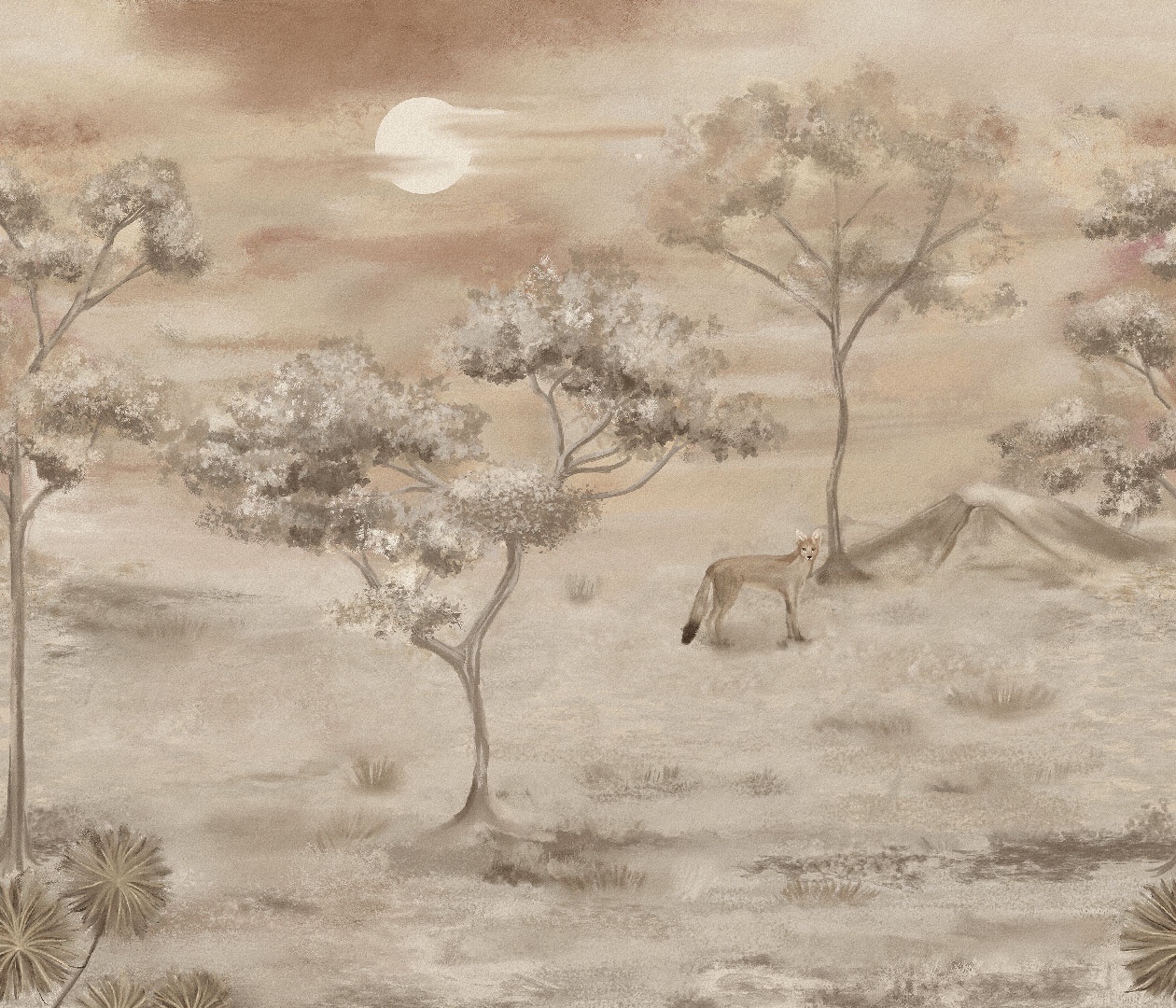 Estampa = Paisagem | Natureza | Animal | Raposa | Árvores | Folhagem | Montanhas | Céu | Lua | Sol | Painel