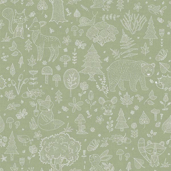 Estampa = Raposa | Árvore | Flor | Folha | Árvore | Noz | Cogumelo | Urso | Lesma | Pássaro