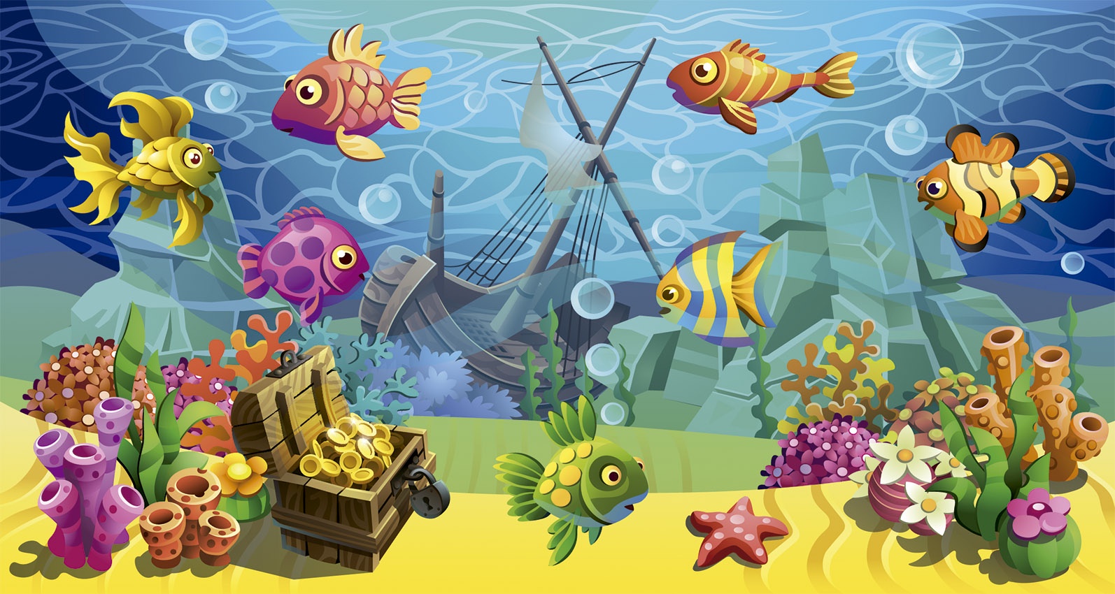 Estampa = Peixe | Navio | Tronco | Baú | Moedas | Corais | Anêmonas | Estrela-do-mar | Bolhas | Painel | Tesouro | Coral | Barco |