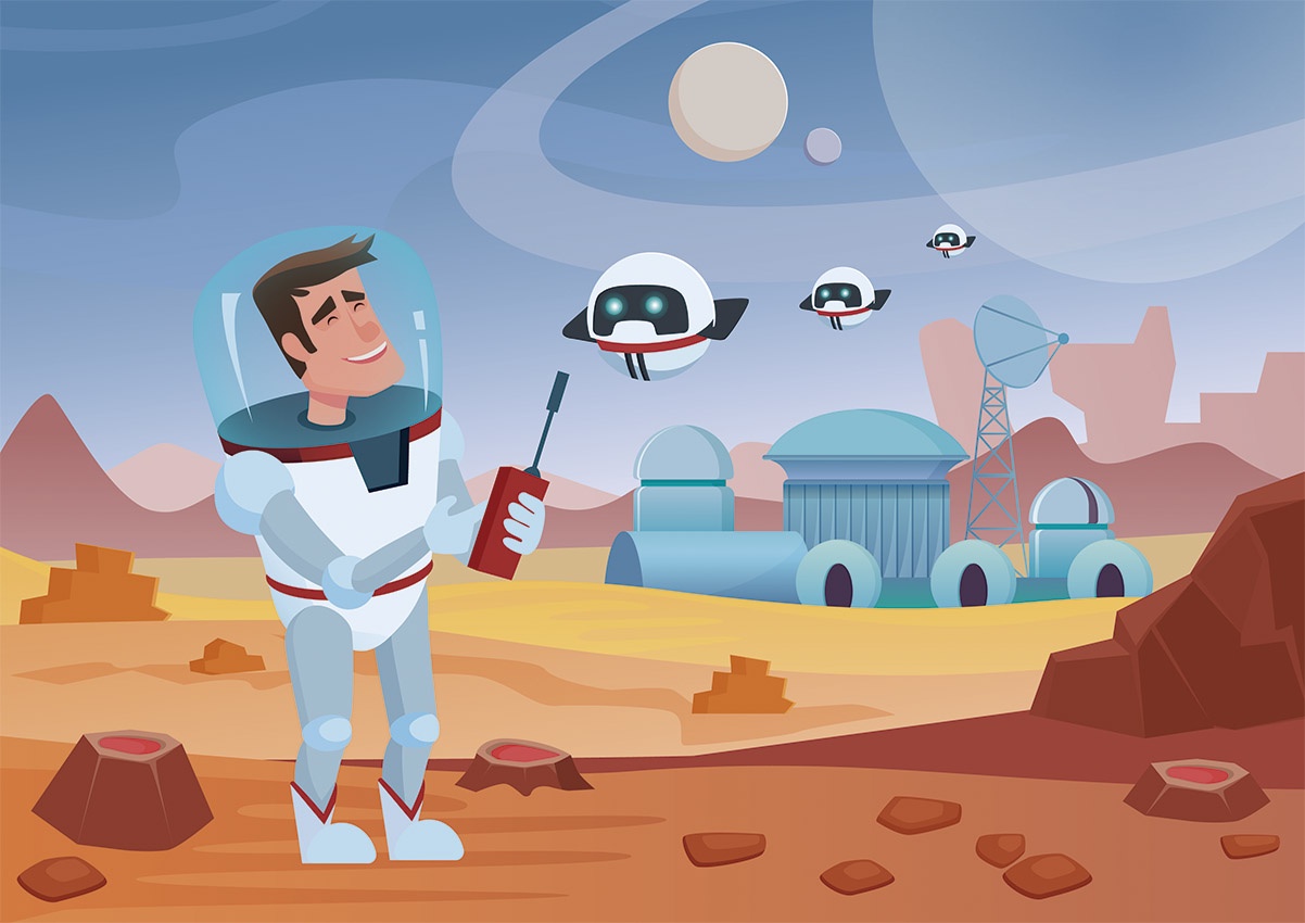 Estampa = Astronauta | Comunicador | Robô Voador | Base Espacial | Antena | Montanha | Crateras | Planeta | Sol | Painel | Robô