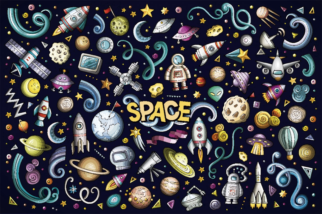 Estampa = Foguete | Planeta | Estrela | Lua | Astronauta | Disco Voador | Satélite | Telescópio | Cometa | UFO | Alça | Buraco Negro | Anel | Texto | Painel