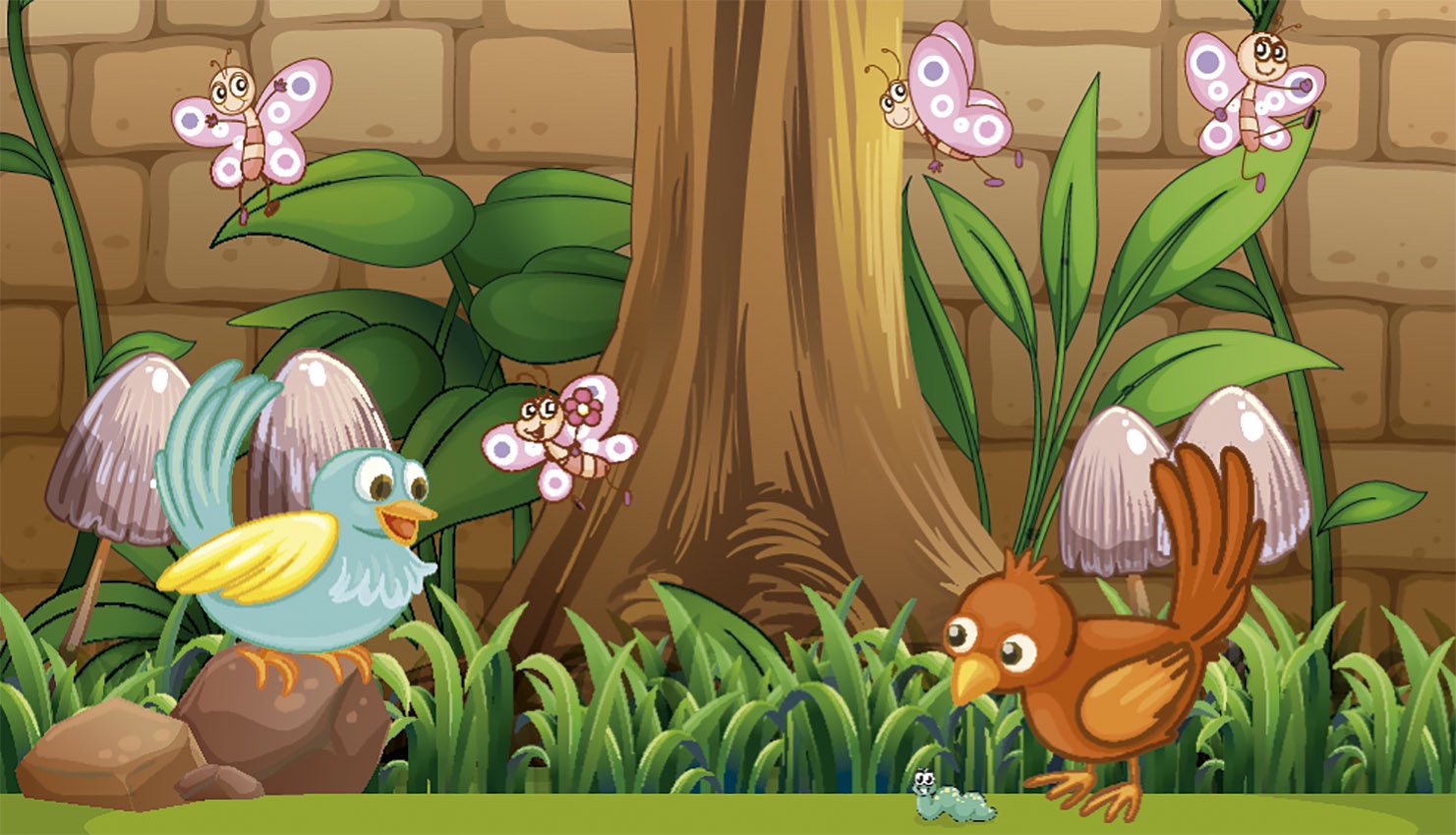 Estampa = Pássaro | Borboleta | Minhoca | Cogumelo | Árvore | Folha | Rocha | Grama | Parede de Tijolos | Painel