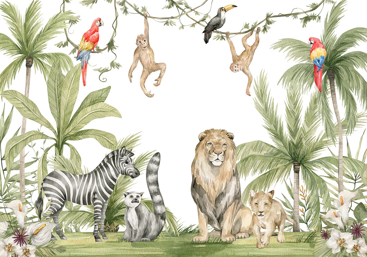 Estampa = Zebra | Lêmure | Leão | Filhote de Leão | Papagaio | Macaco | Tucano | Palmeira | Cipó | Flor | Painel