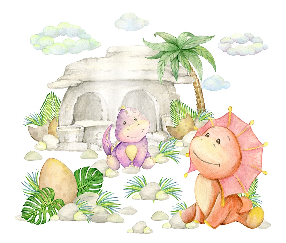 Estampa = Dinossauro | Caverna | Ovo | Palmeira | Folha | Pedra | Nuvem | Painel