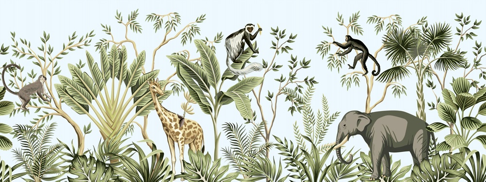 Estampa = Macaco | Girafa | Elefante | Palmeira | Folha | Planta | Cipó | Painel