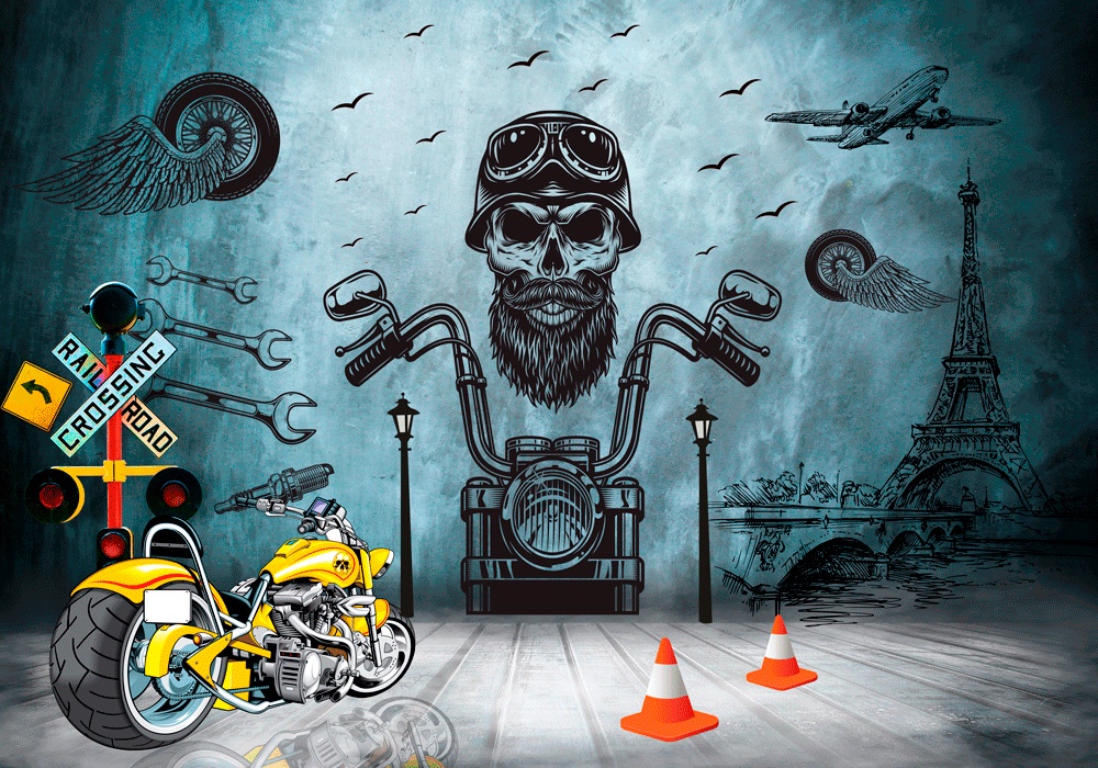 Estampa = Motocicleta | Caveira | Asa | Chave Inglesa | Semáforo | Placa de Estrada | Cone | Torre Eiffel | Ponte | Farol | Avião | Pássaro | Painel