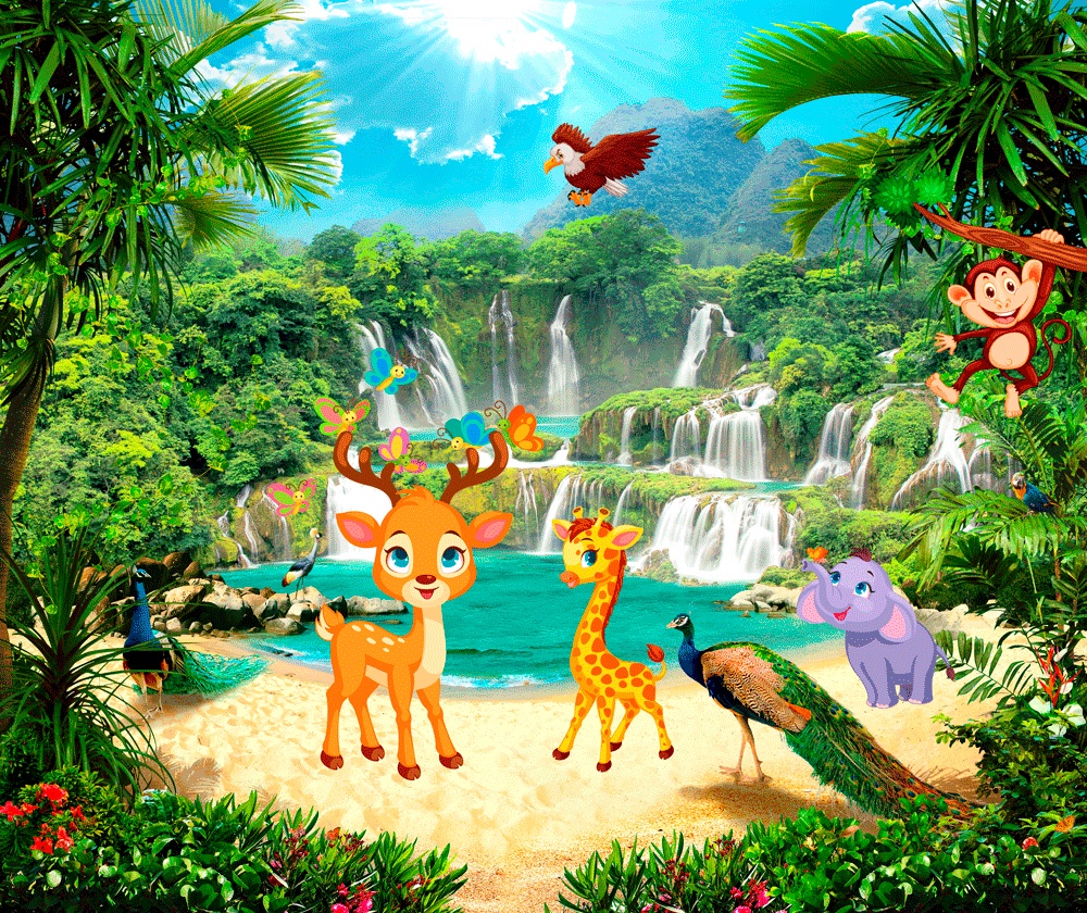 Estampa = Cervo | Girafa | Elefante | Macaco | Pavão | Arara | Borboleta | Pássaro | Palmeira | Árvore | Folhagem | Flores | Praia | Areia | Água | Cachoeira | Montanha | Céu | Sol | Painel