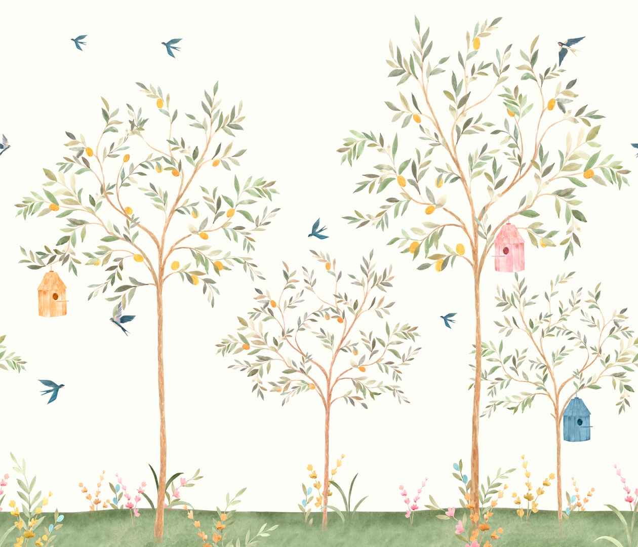 Estampa = Infantil | Folha | Folhas | Árvore | Flor | Flores | Painel | Casa de Pássaros | Pássaros |