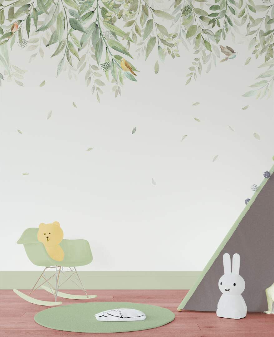 Estampa = Folhagem | Folhas | Folha | Painel | Infantil | Pássaro | Animal