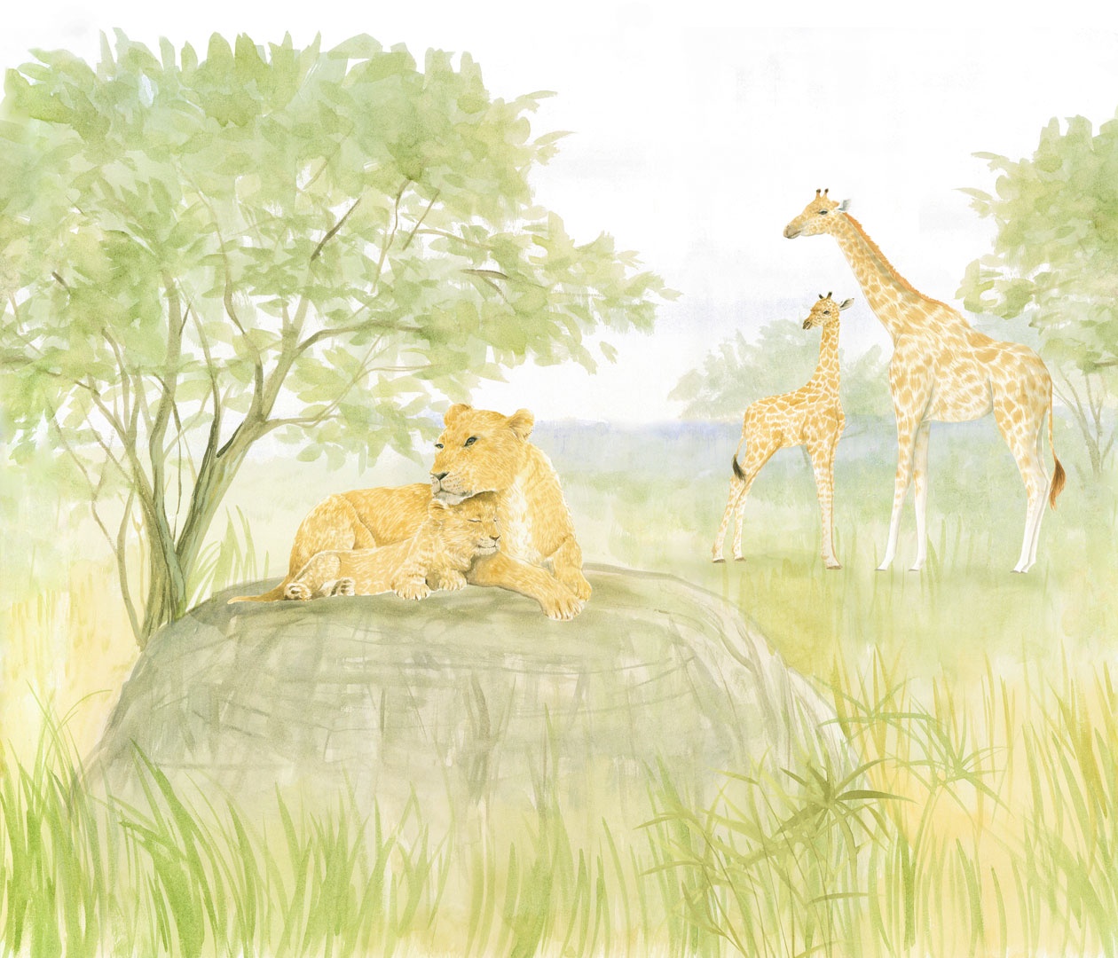 Estampa = Safari | Animal | Painel | Leoa | Girafa | Filhote | Árvore | Grama | Folhas