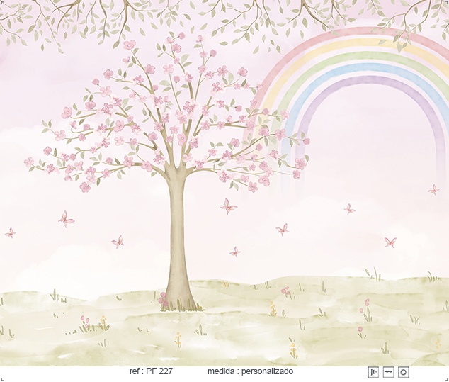 Estampa = Folhas e Flores | Folhas | Flores | Borboleta | Flor | Folha| Painel | Árvore | Nuvens | Céu | arco-Iris