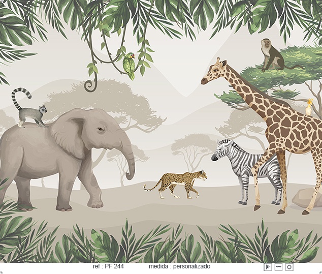 Estampa = Safari | Onça | Animal | Animais | Zebra | Elefante | Girafa | Macaco | Folha | Papagaio | Pedra