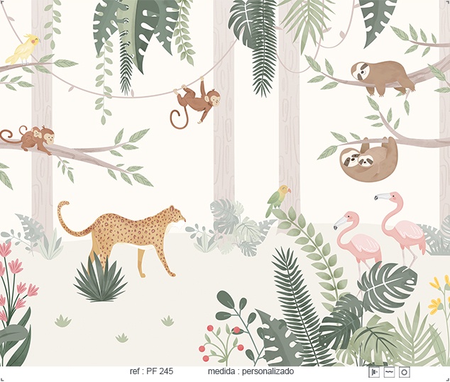 Estampa = Safari | Onça | Animal | Animais | Preguiça | Floresta | Girafa | Macaco | Folha | Flamingo | Pássaro | Painel | Árvore