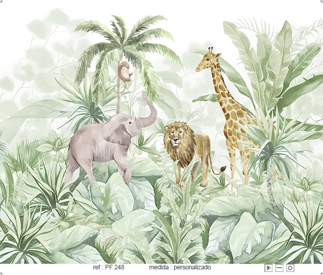Estampa = Safari | Folha | Leão | Elefante | Girafa | Macaco | Árvore | Floresta | Painel