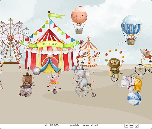 Estampa = Circo | Animal | Animais | Elefante | Leão | Urso | Malabarista | Tenda | Listrado | Balão | Roda Gigante | Bicicleta | Rato | Carrosel