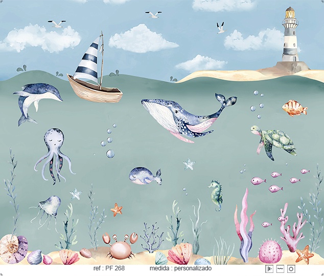 Estampa = Mar | Baleia | Painel | Peixe | Tartaruga | Polvo | Alga | Agua | Coral | Barco | Farol | Nuvens | Cavao Marinho