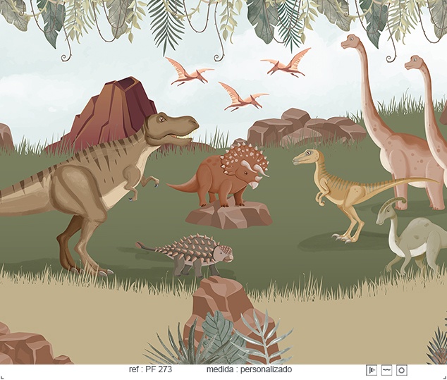 Estampa = Dinossauro| Nuven | Montanha | Painel | Sol | Árvore | Folha