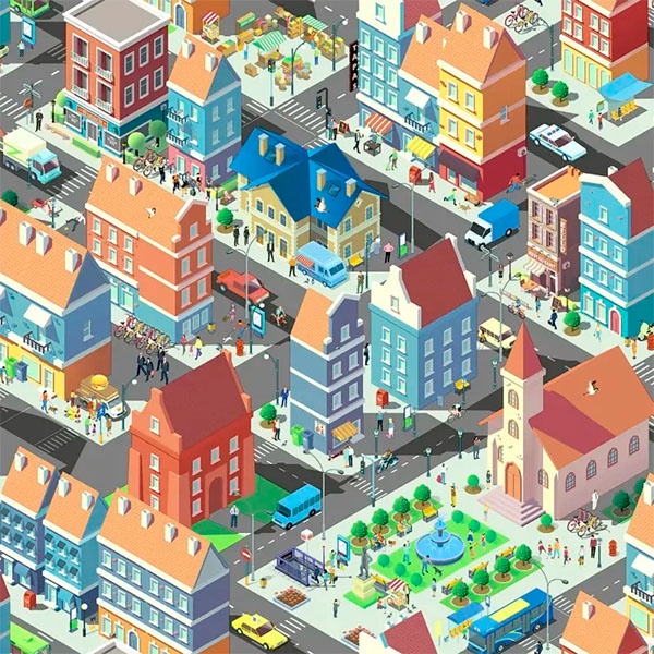 Estampa = Cidade | 3D | Prédios | Pessoas | Casas | Carros | Fonte | Caminhão | Feira | Pássaros | Bicicleta | Taxi | Onibus | Árvore | Chaminé