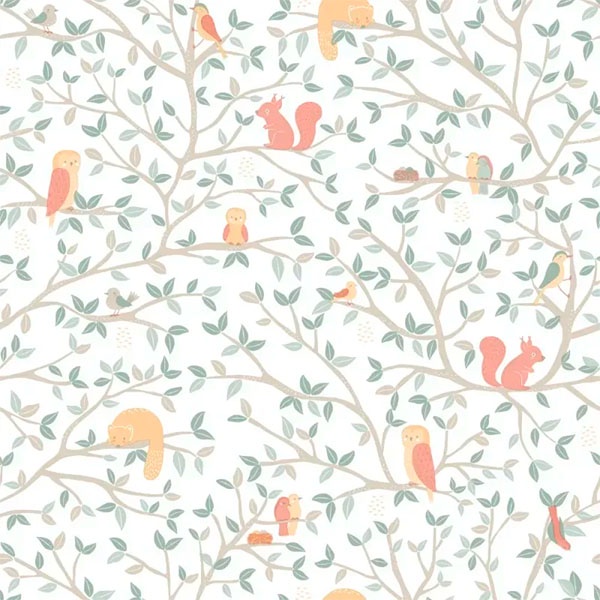 Estampa = Pássaro | Esquilo | Ninho | Folha | Árvore | Galhos | Coruja