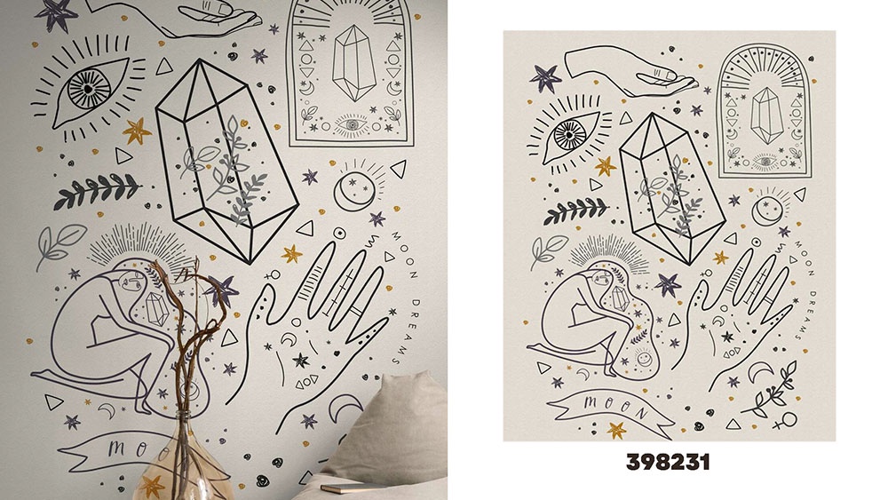 Estampa = Mãos | Olho | Cristais | Galhos | Folhas | Estrelas | Lua | Sol | Ondas | Mulher | Frases | Símbolos