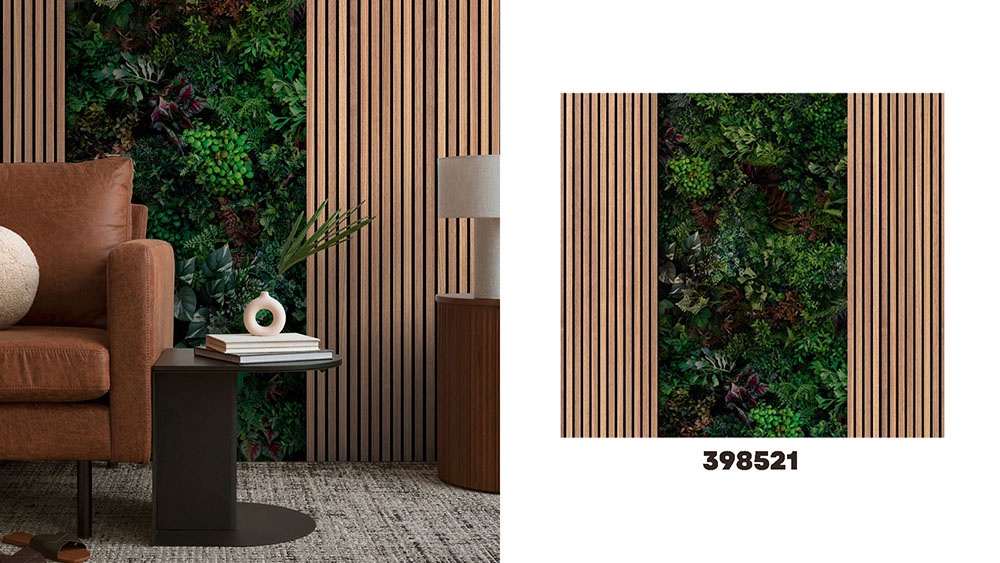 Estampa = Jardim vertical | Folhagem | Madeira | Ripas | Painel | Plantas | Natureza