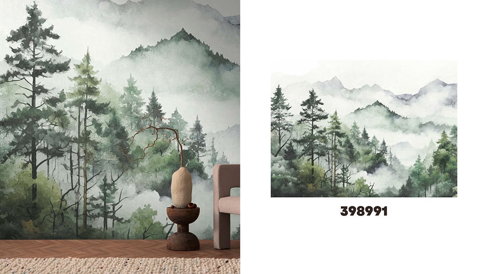 Estampa = Floresta | Montanhas | Névoa | Árvores | Pinheiros |