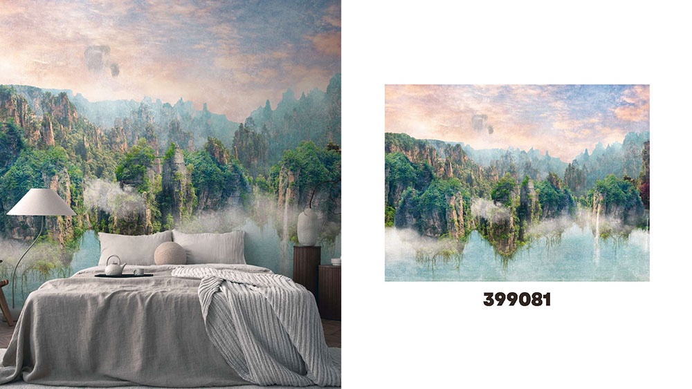 Estampa = Montanhas | Névoa | Água | Reflexo | Céu |